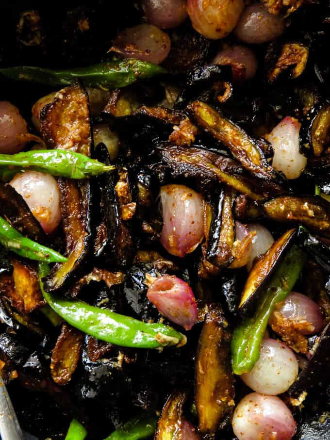 Fried eggplant combined with spices, vinegar, and sugar—perfect with rice and curries.