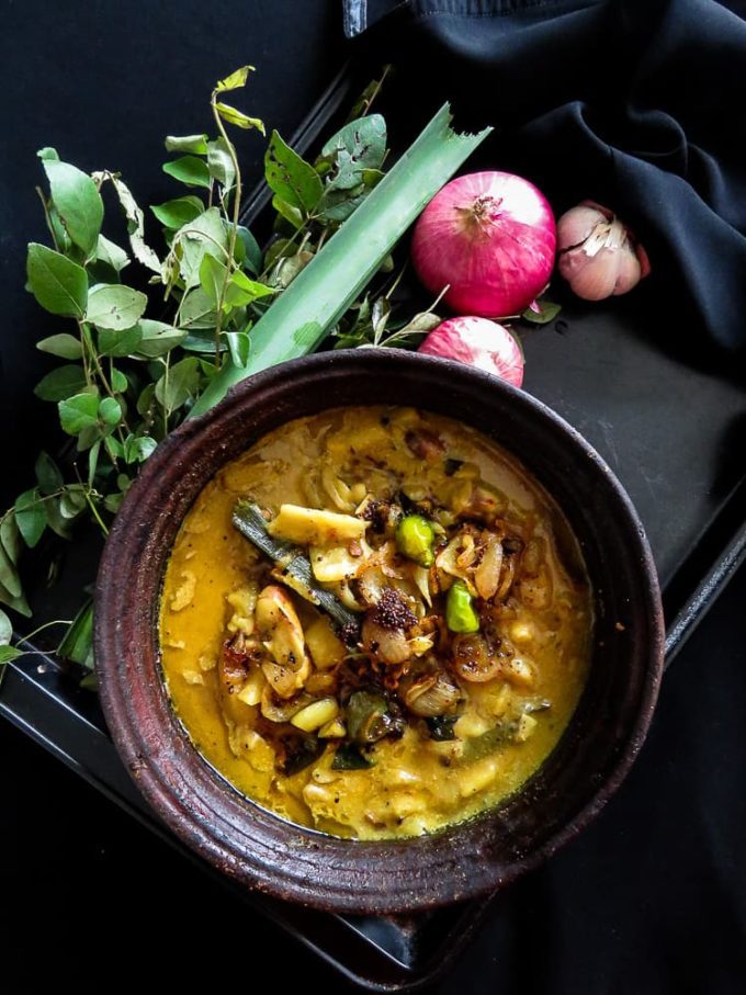 Made using seasonal vegetables like pumpkin, beans, brinjal, or ash plantain.